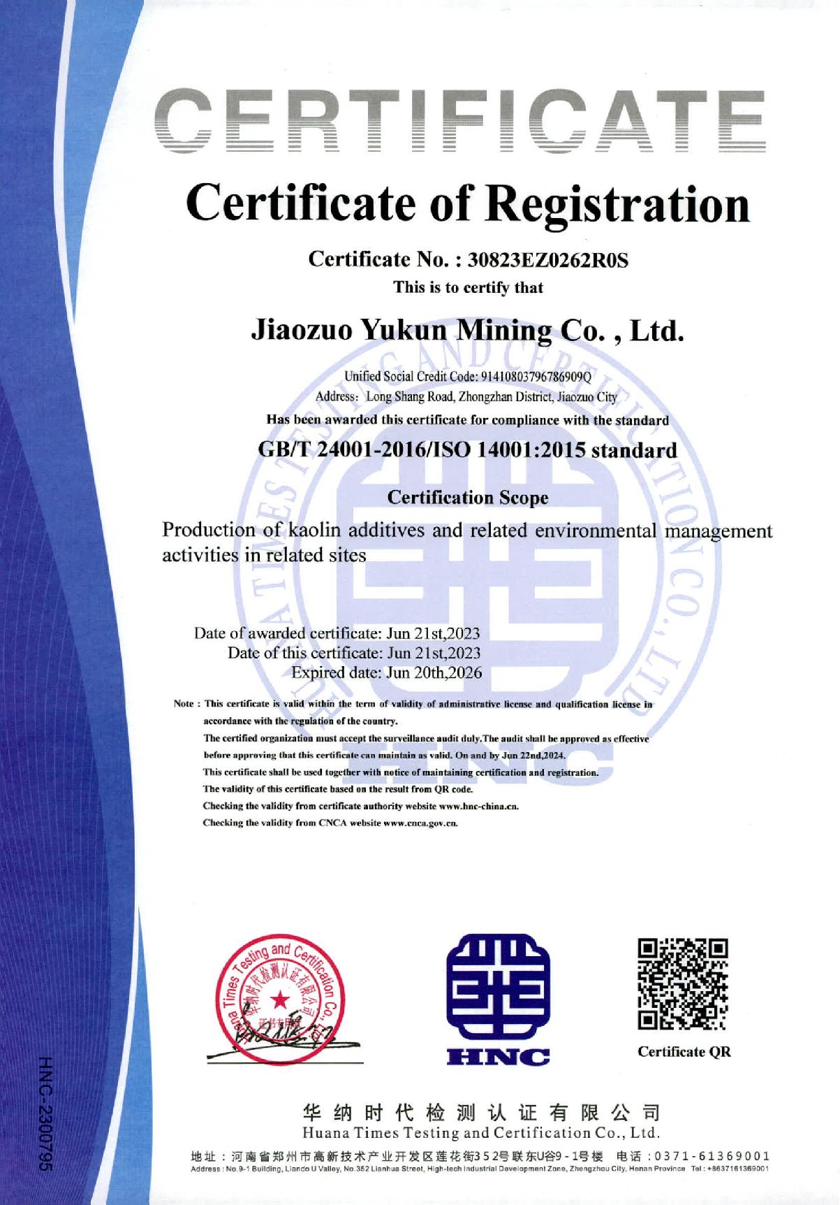 環(huán)境管理體系認證證書-英文版
